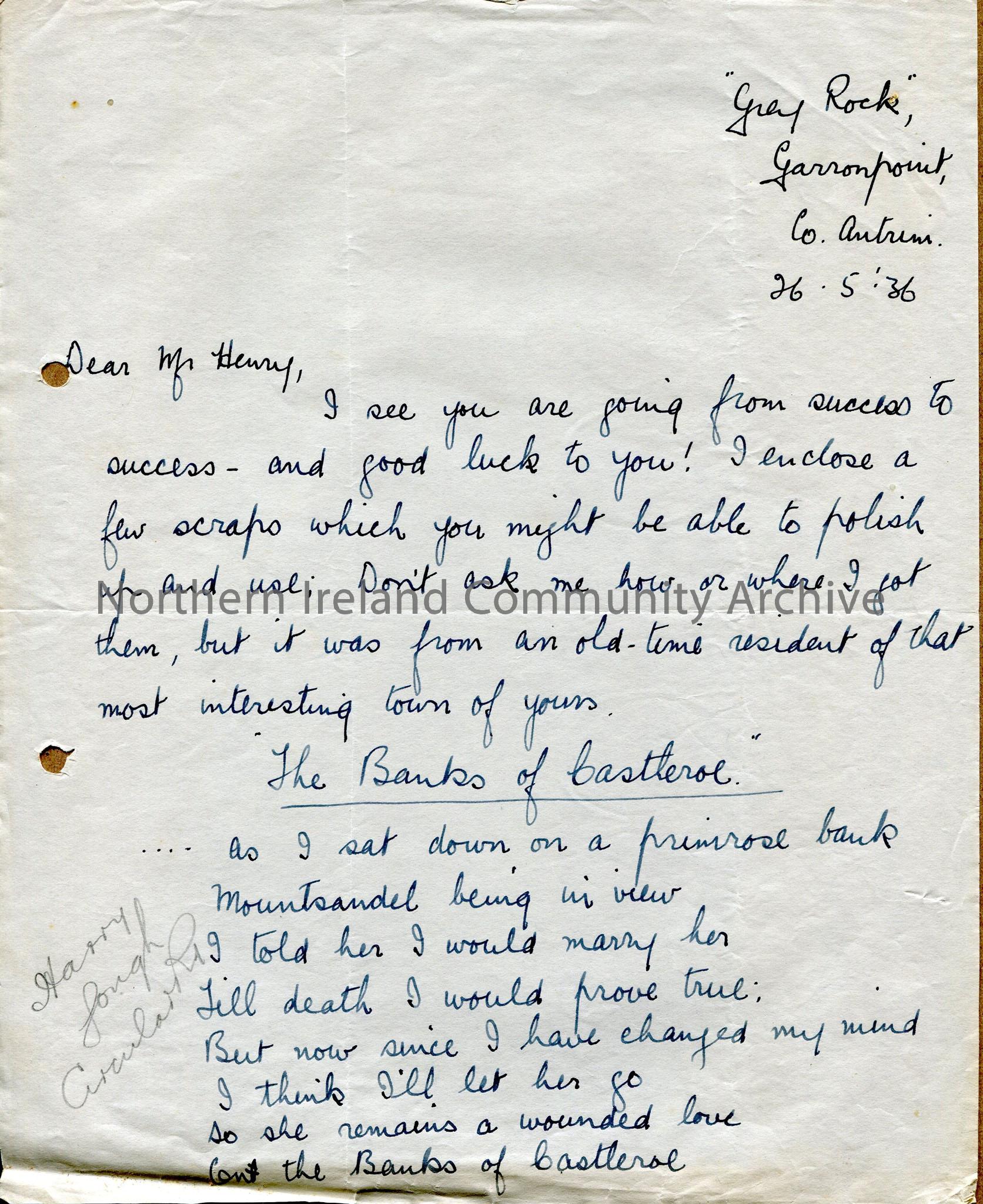 One of 3 pages of handwritten letter with words to songs collected by author, with notes to where and who from he obtained them e.g dance in barn. Comments on Sam going 'from success to success'.