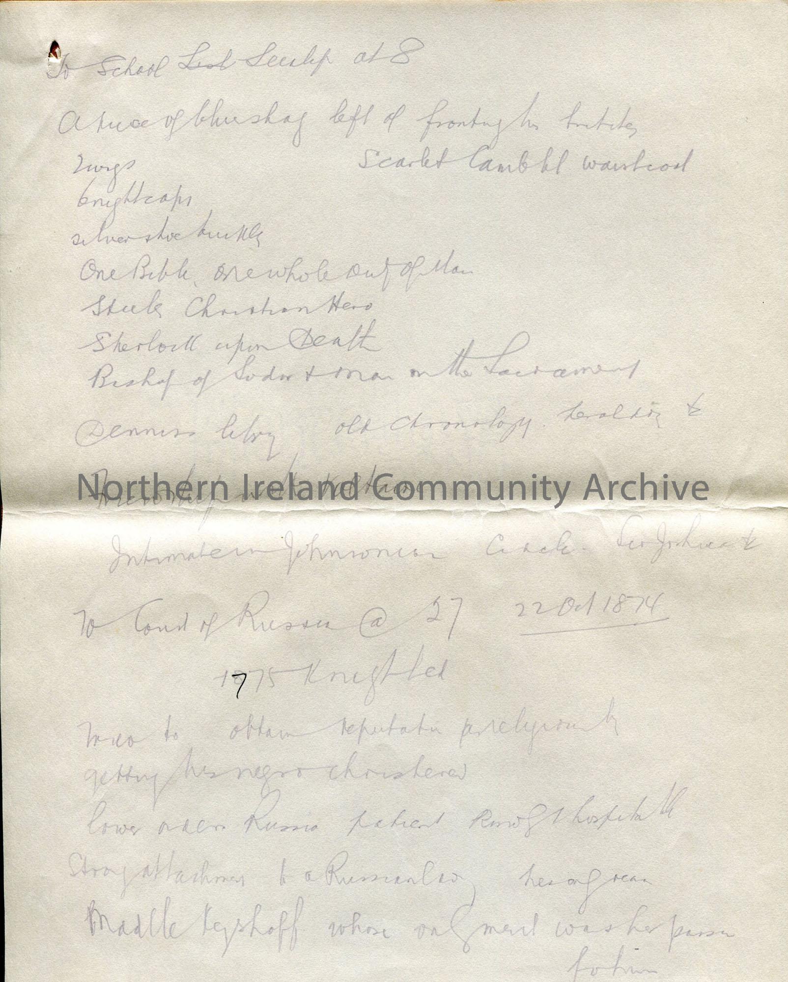 One of 3 pages of handwritten rough notes - life of Lord McCartney, first Earl - school days, affection for Lissanoure, life as ambassador in Russia, brief outline of particular family line.
