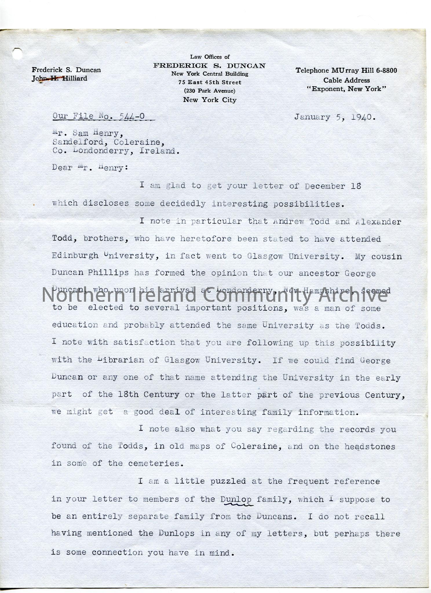 One of 3 pages of typed letter on headed notepaper. Relates to Todd and Duncan university attendance in Glasgow, intermarrying of Duncans and Culbertsons in Scotland, Northern Ireland and Pennsylvania and likelihood that Coleraine is location of origin in Northern Ireland