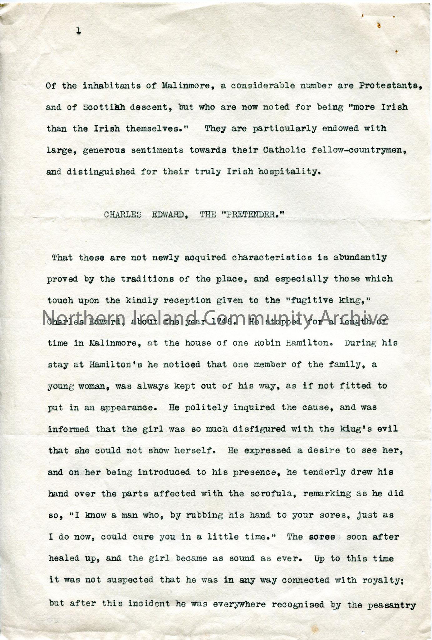 One of 3 pages of typed script about Prince Charlie's alleged stay in Donegal as he fled Scotland in the aftermath of Culloden. Describes stays at house of Hamiltons and a Charles MacGinley [McGinley], and his curing of a young girl with skin disease