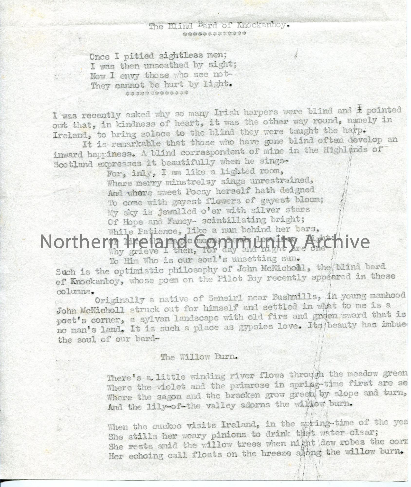 One of 3 pages of typed script (for newspaper - refers to 'these columns'), under heading 'The Blind Bard of Knockanboy' - John McNicholl. Gives his background, referring to his Scottish descent, his livelihood, family tragedy, influences and poems he has written. Quotes lines from a blind friend in Scotland and songs he sings.