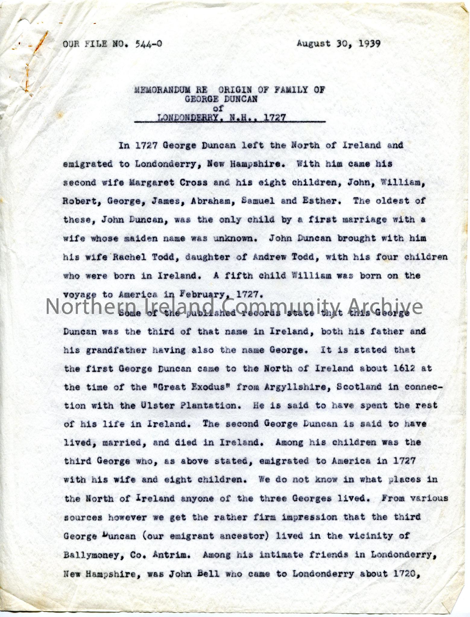 One of 3 pages of typed script under heading 'Memorandum re Origin of Family of George Duncan of Londonderry N.H. [New Hampshire, USA] 1727. Covers migration of George and his family and son John (wife was a Todd) and his family, origins in North of Ireland and Scotland, links to Culbertsons in Scotland, Ireland and America.