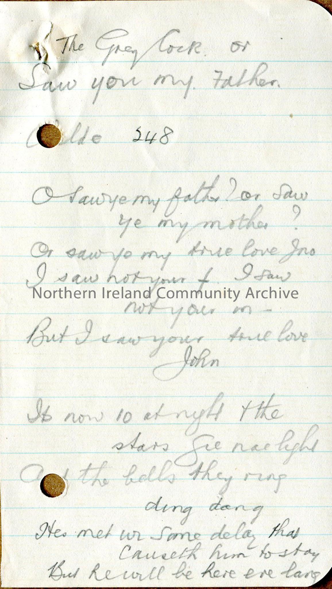 One of 3 pages with handwritten words to ‘The Grey Cock or Saw you my Father’. Uses local dialect