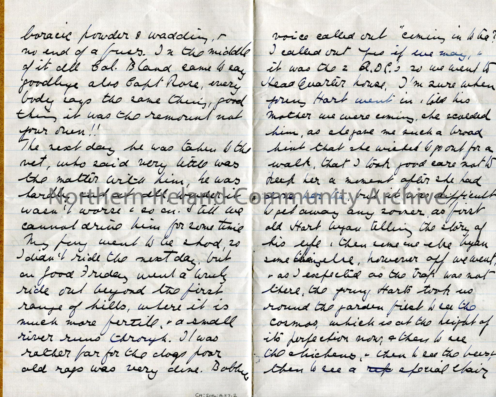 One of 4 pages (3 folded and 1 single) of handwritten letter from Dorothy to her mother. Discuses military St Patrick’s Night antics, horse riding eac… – img081b