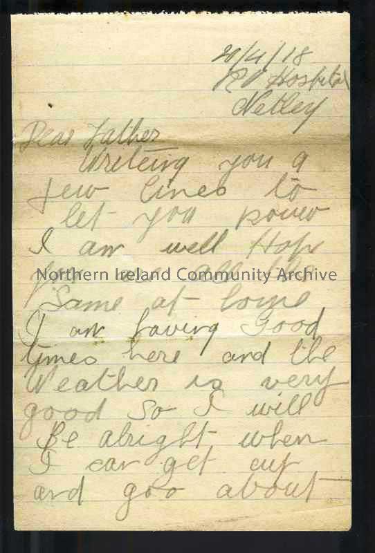 One of 4 pages of handwritten letter in pencil from James to his father. Hopes to be sent to Randalstown convalescent camp when leg improves. Lots of …