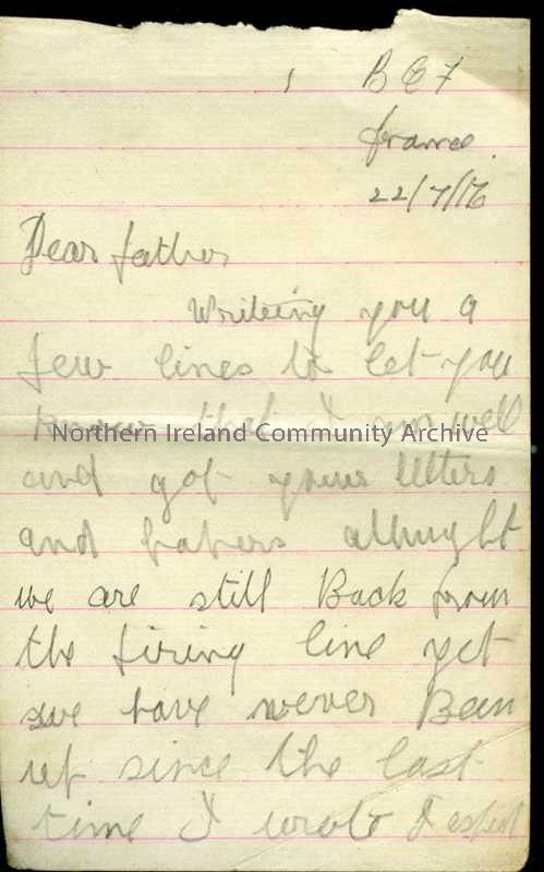 One of 4 pages of handwritten letter in pencil from James to his father. Still back from firing line. Mentions ?Tommie ??Neely – killed – “one never k…