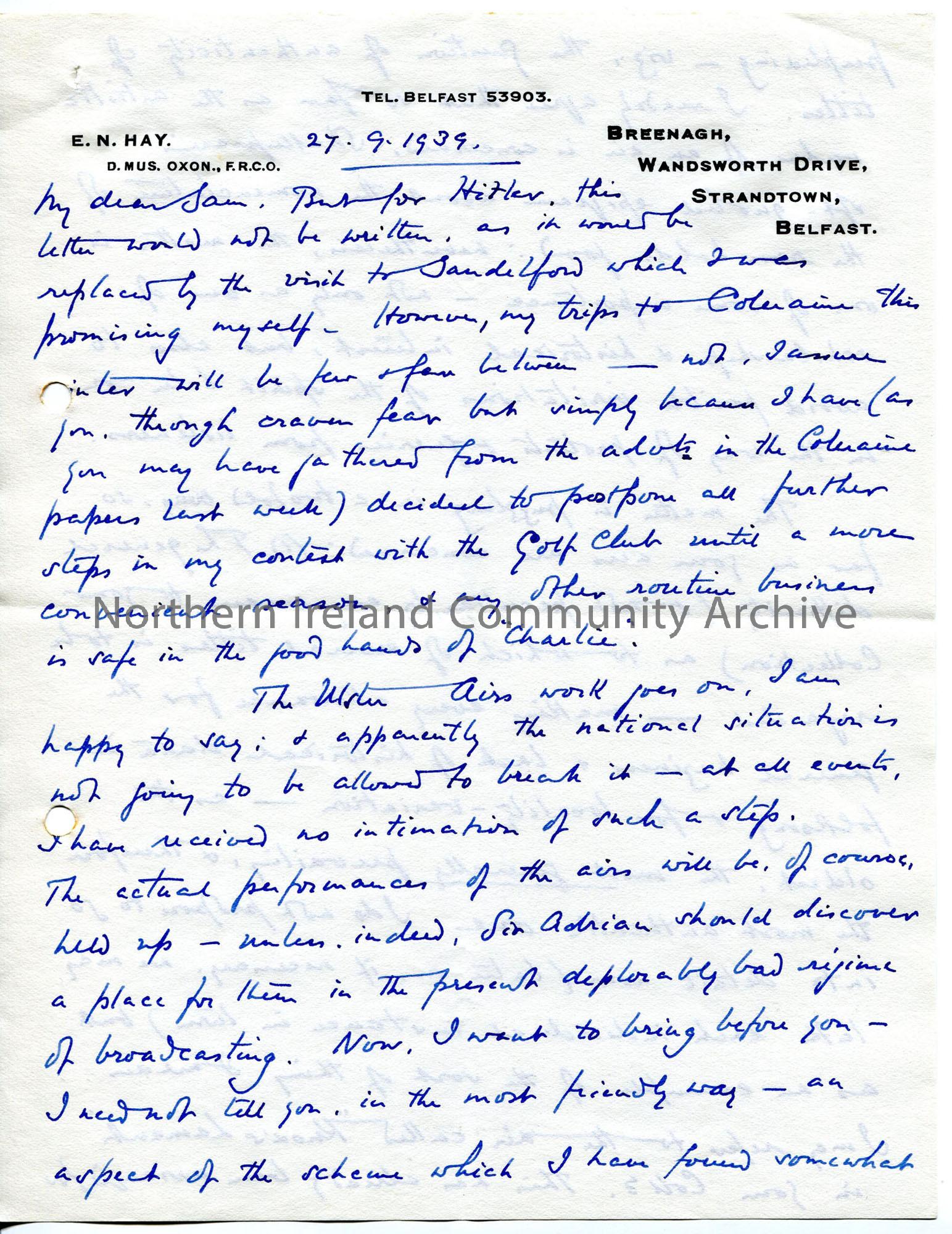 One of 4 pages of handwritten letter, using 8 sides. Hilter and WWII should not interrupt work on Ulster Airs but will affect broadcasting of it. Worr…