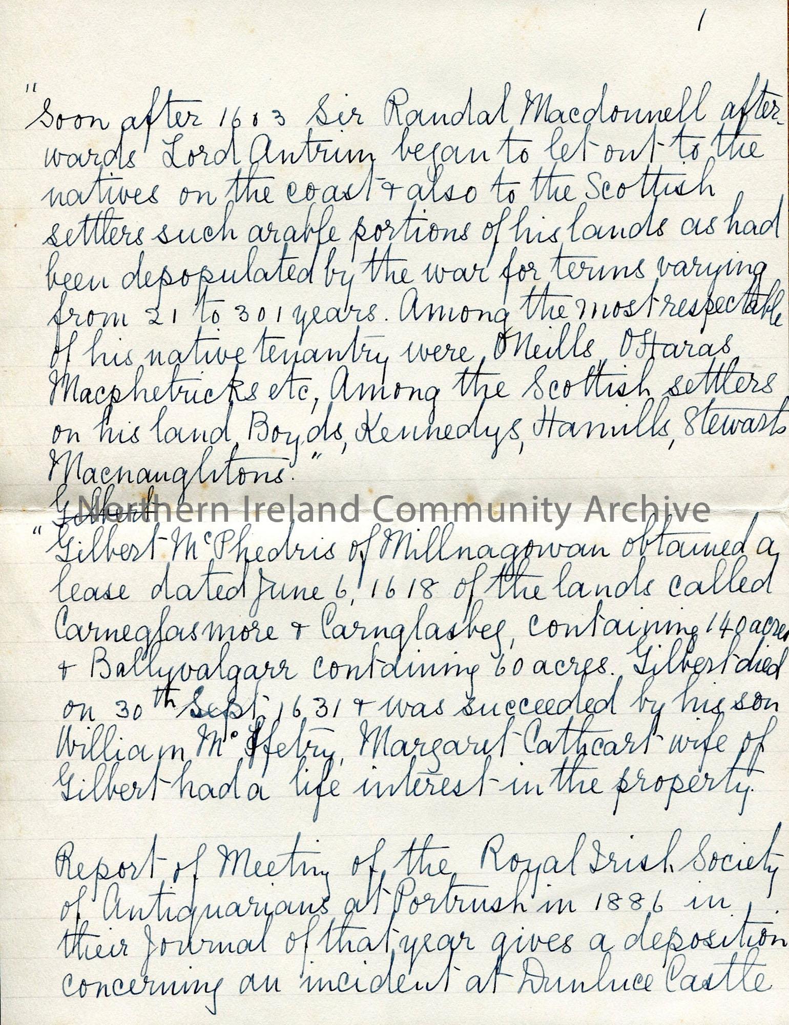One of 4 pages of script taken down from her mother by E E White - McDonnell's Scottish settlers, lease 1618 to a McPhedris, name change over centuries, mentioned in 1641 depositions (see attached), McFetridge had bookcase doors made from old Dunluce Church when dismantled, agent to MacNaughton of Beardiville.