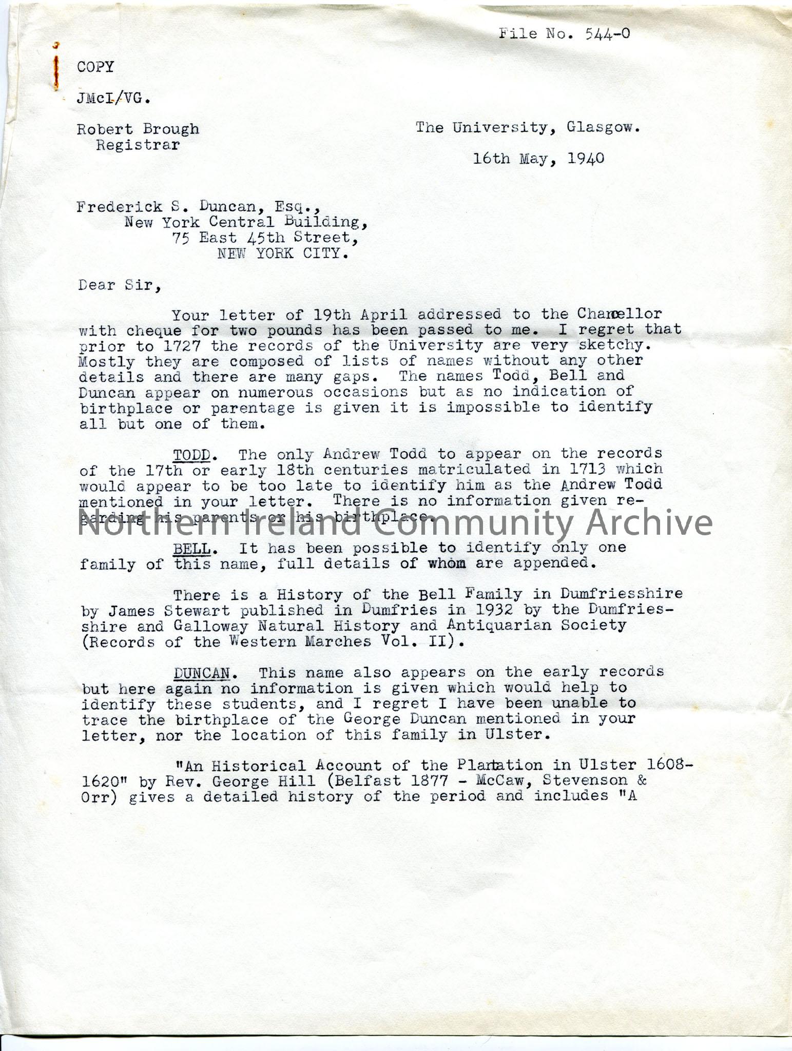One of 4 pages of typed letter. Names Todd, Bell and Duncan appear frequently on pre-1727 lists but without any detail. Has been able to identify one …