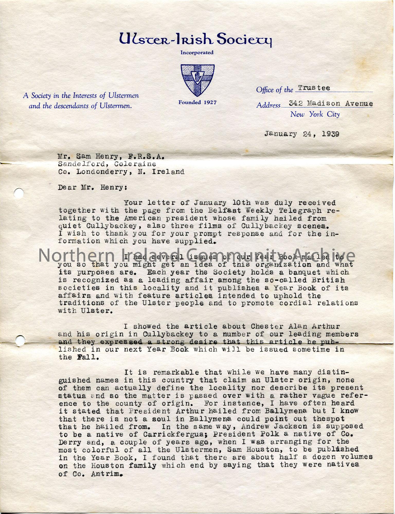 One of 4 pages of typed letter on headed notepaper of Ulster-Irish Society. Outlines their purpose, publications, discusses other famous Americans of Ulster origin, thanks Sam for article etc sent about Chester Arthur and invite him to contribute same for their next Year Book.