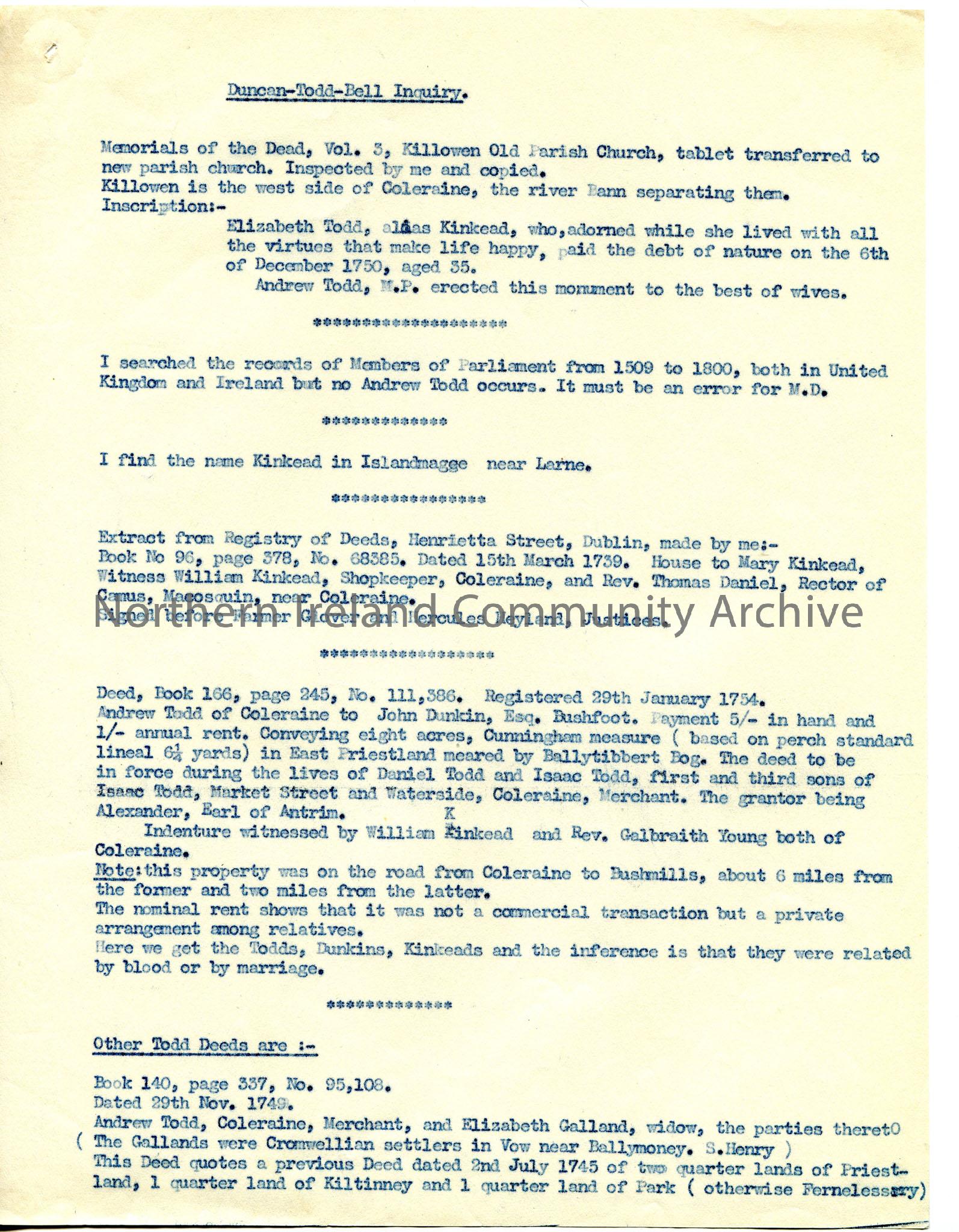 One of 4 pages of typed notes under heading 'Duncan-Todd-Bell-Inquiry' - extracts from various sources - memorials of the dead, Registry of Deeds in Dublin, Presbyterian Church records, Protestant Householders, Merchant Taylors rental records. Duncan also referred to as Dunkin