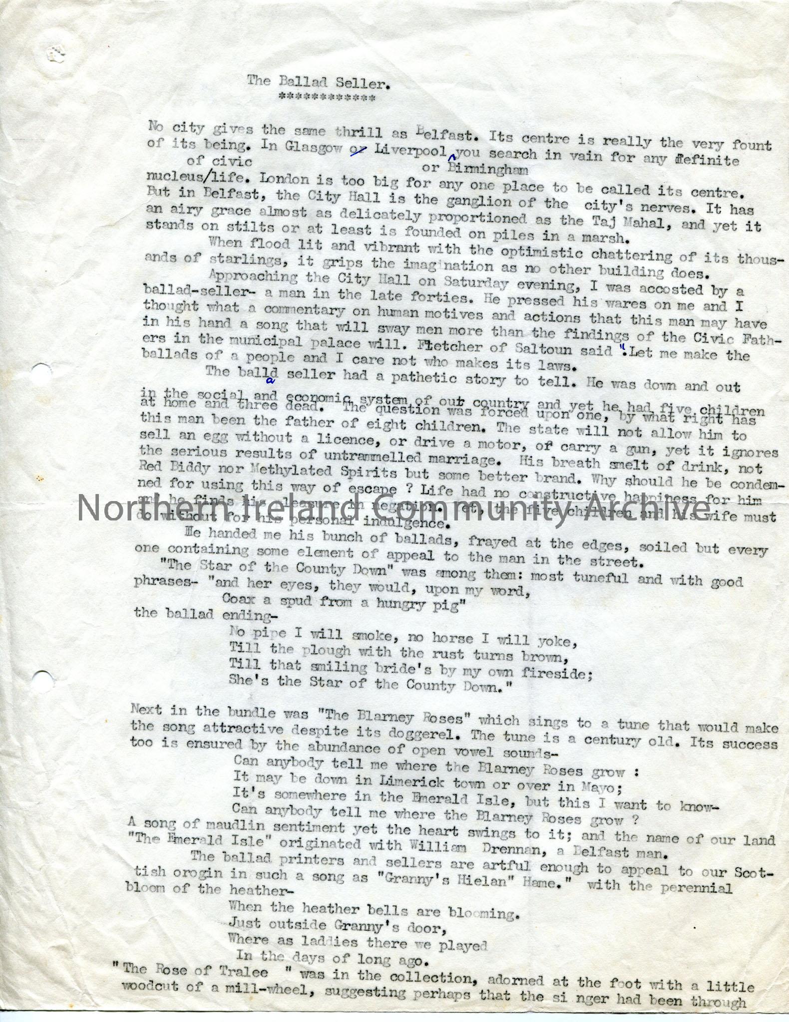 One of 4 pages of typed ? script for broadcast – relates evening encounter with Ballad Seller at Belfast City Hall, where he found a song previously u…