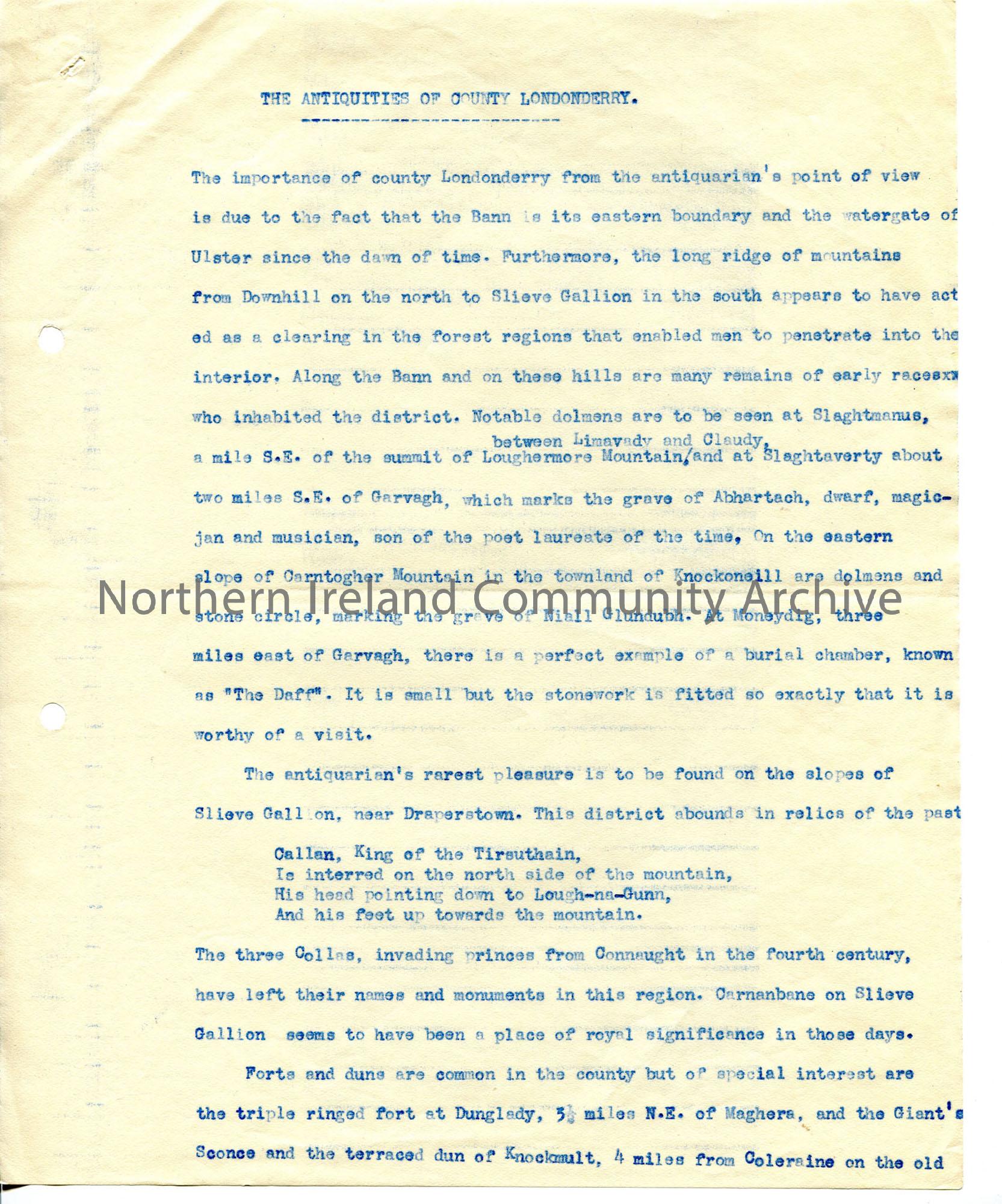 One of 4 pages of typed script under heading ‘The Antiquities of County Londonderry’. Description of County Londonderry in terms of ancient structures…