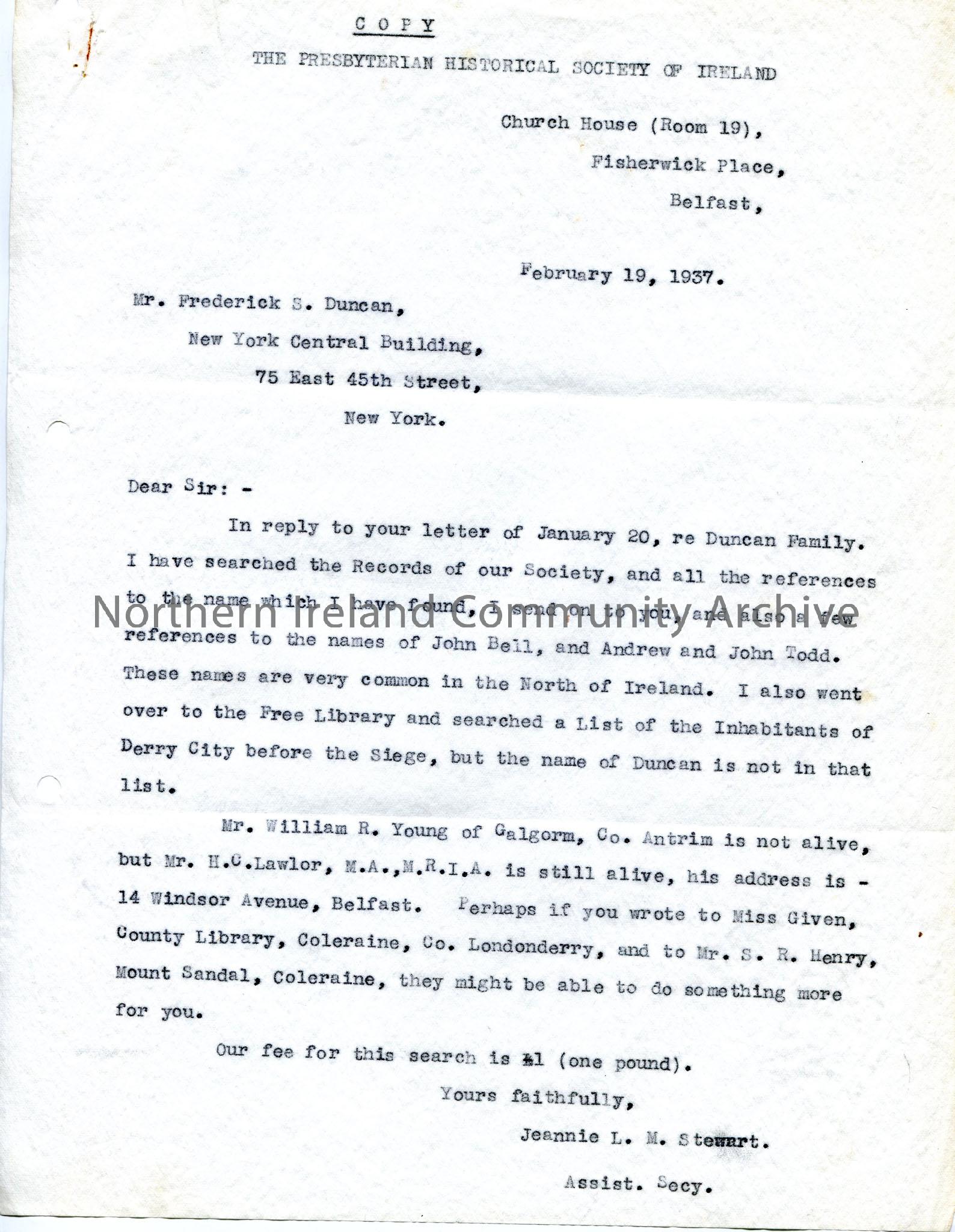 One of 4 typed pages - letter and information from variety of 17th and 18th century records in Presbyterian Historical Society re the Duncan, Bell and Todd families. 3 pages of information plus advises he contacts sam Henry and Miss Given in Coleraine Library
