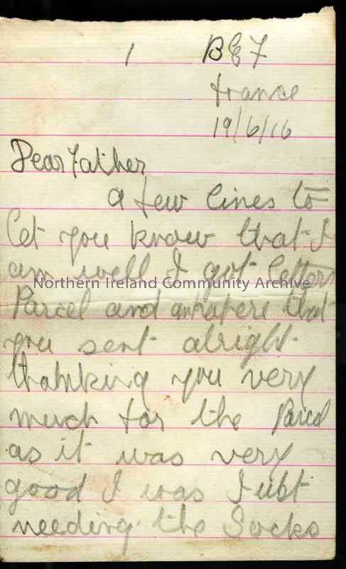 One of 5 pages of handwritten letter in pencil from James to his father. Received socks. Talks of father being fined by Leech for taking sticks from wood. Mentions Georgina, Mr McAfee (witness against Alex). Sending home leaflet issued by Kitchener previous year, as a memorial and souvenir