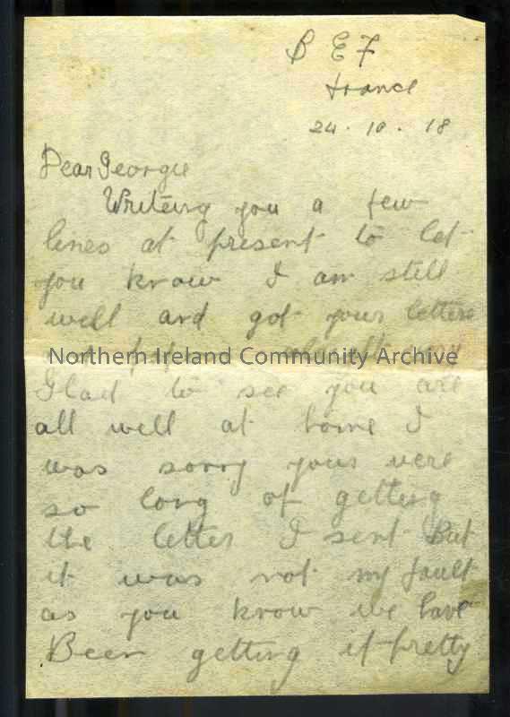 One of 5 pages of handwritten letter in pencil from James to sister Georgina [Georgie]. Fighting has been heavy, moving forward. William [brother] in tug of war team. Refers to ongoing enlistment. Refers to Maggie Sweeny, Sammie Millar, the Rhine.