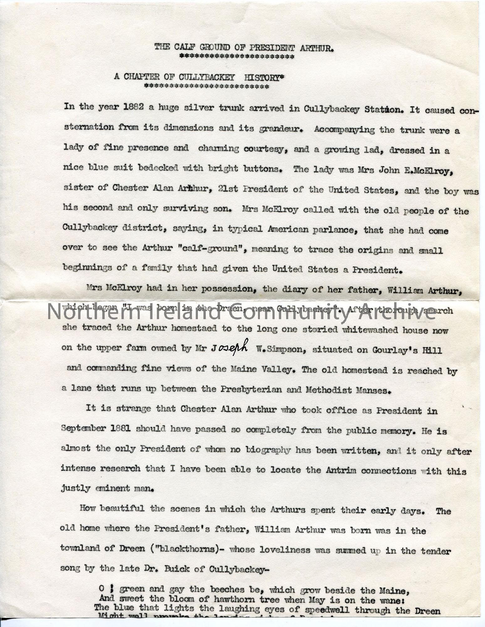 One of 5 typed pages under the heading 'The Calf Ground of President Arthur'. Phrase comes from Mrs McElroy, Arthur's sister, during her visit to Cullybackey in 1882 with Arthur's son. Gives details of marriages, lands held, Scottish origins, living relatives in Northern Ireland, American life. Notes that Arthur is one of very few Presidents not to have biography written [at that time]