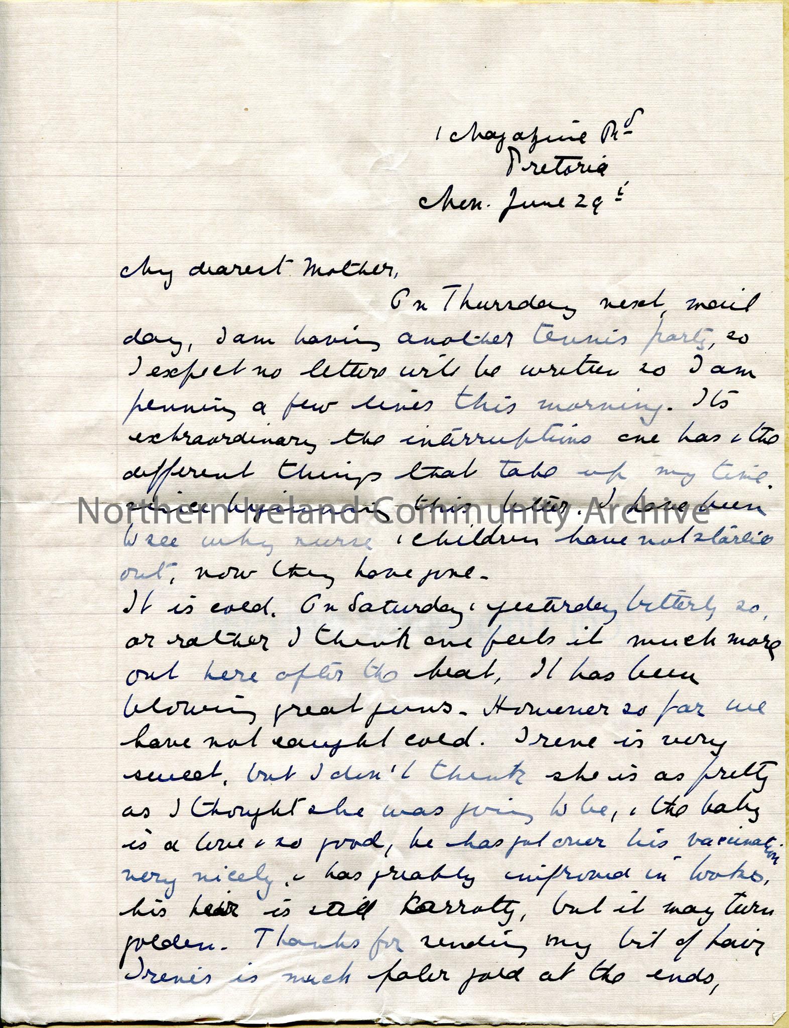 One of 6 pages of handwritten letter from Dorothy to her mother. Mostly about her children, Irene and Arthur [a newly arrived baby], tennis party, gol…