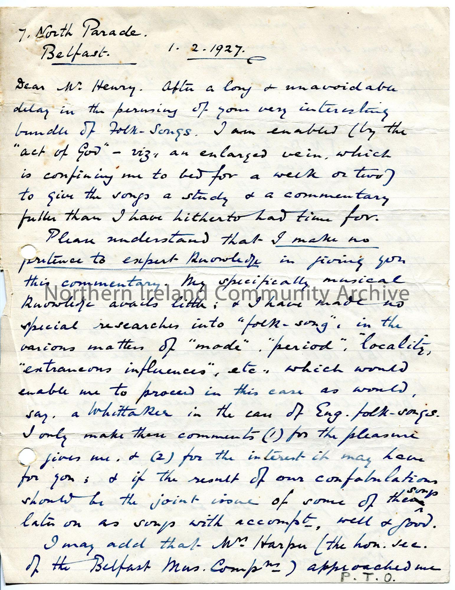 One of 6 pages of handwritten letter, on both sides of page. Author of letter is reporting back on bundle of folk songs sent to him by Sam – picked th…