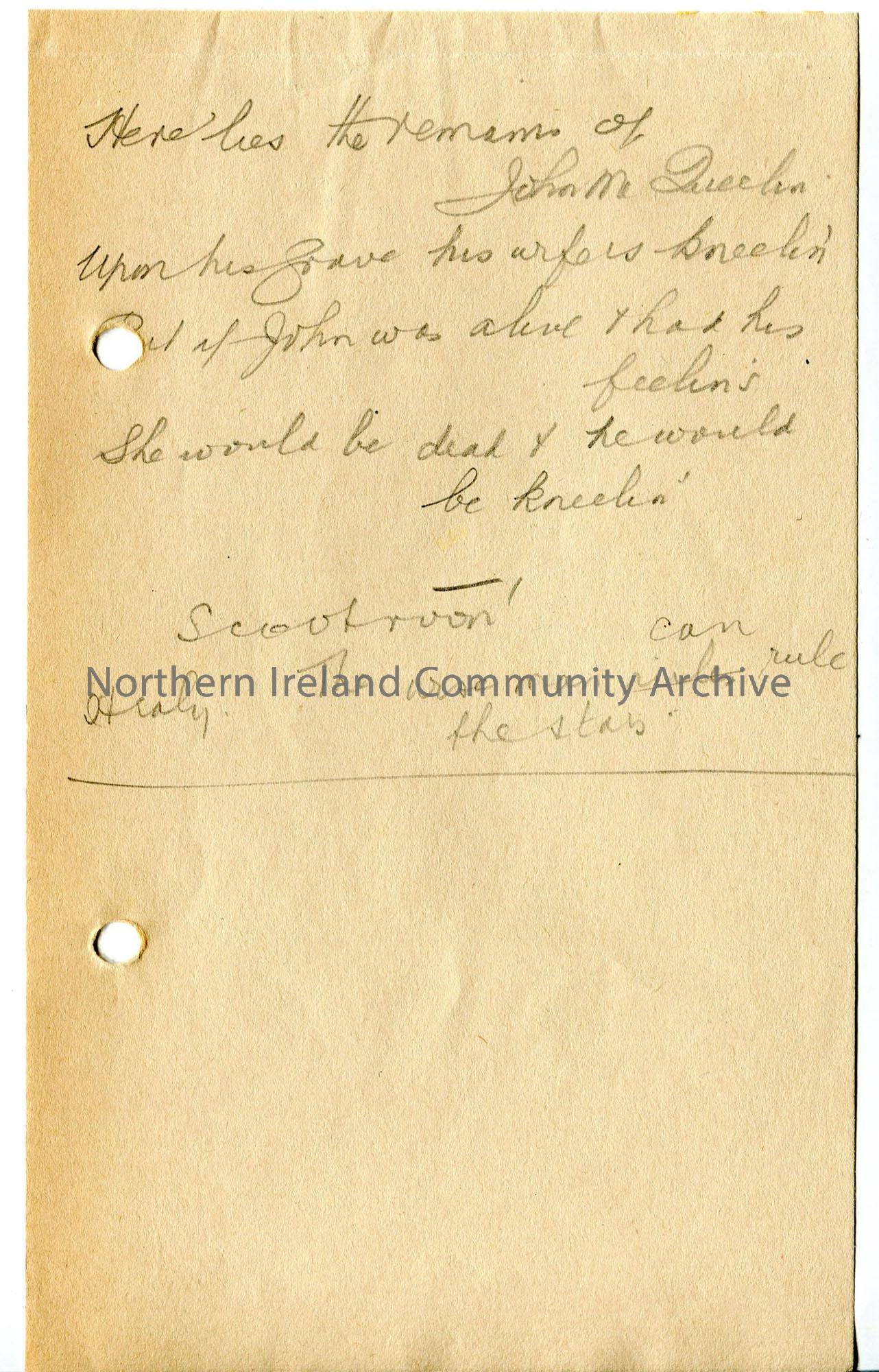 One of 6 pages of handwritten notes - seems to be of headstone inscriptions - one full one (comic verse - ? real) and then brief extracts - names, short sentences (? inscriptions). Numbered - relates to grave number.