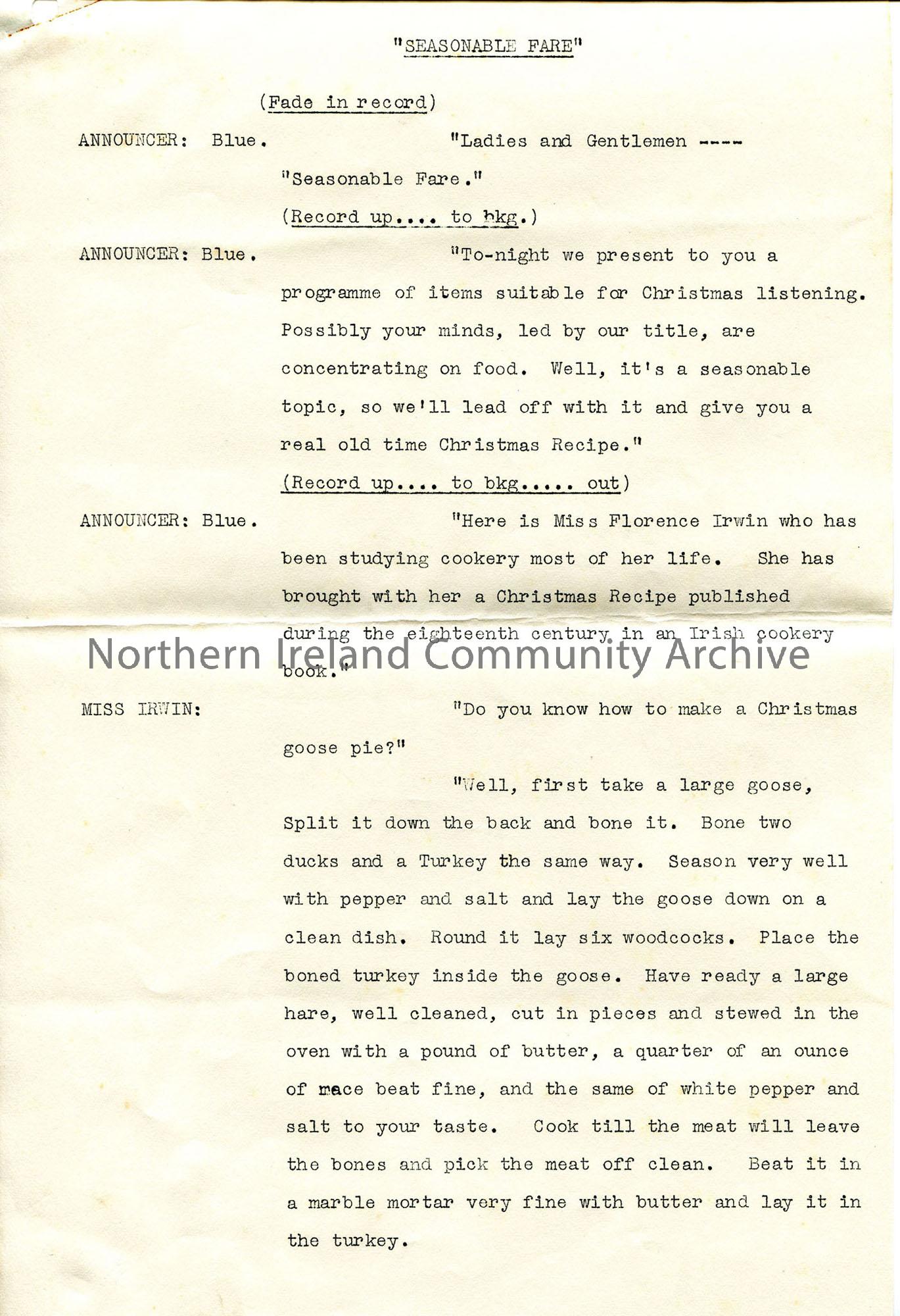 One of 6 pages of script, under heading ‘Seasonal Fare’, relating to ‘Ulster Christmas’ programme. Set out with parts for each speaker – about recipes…