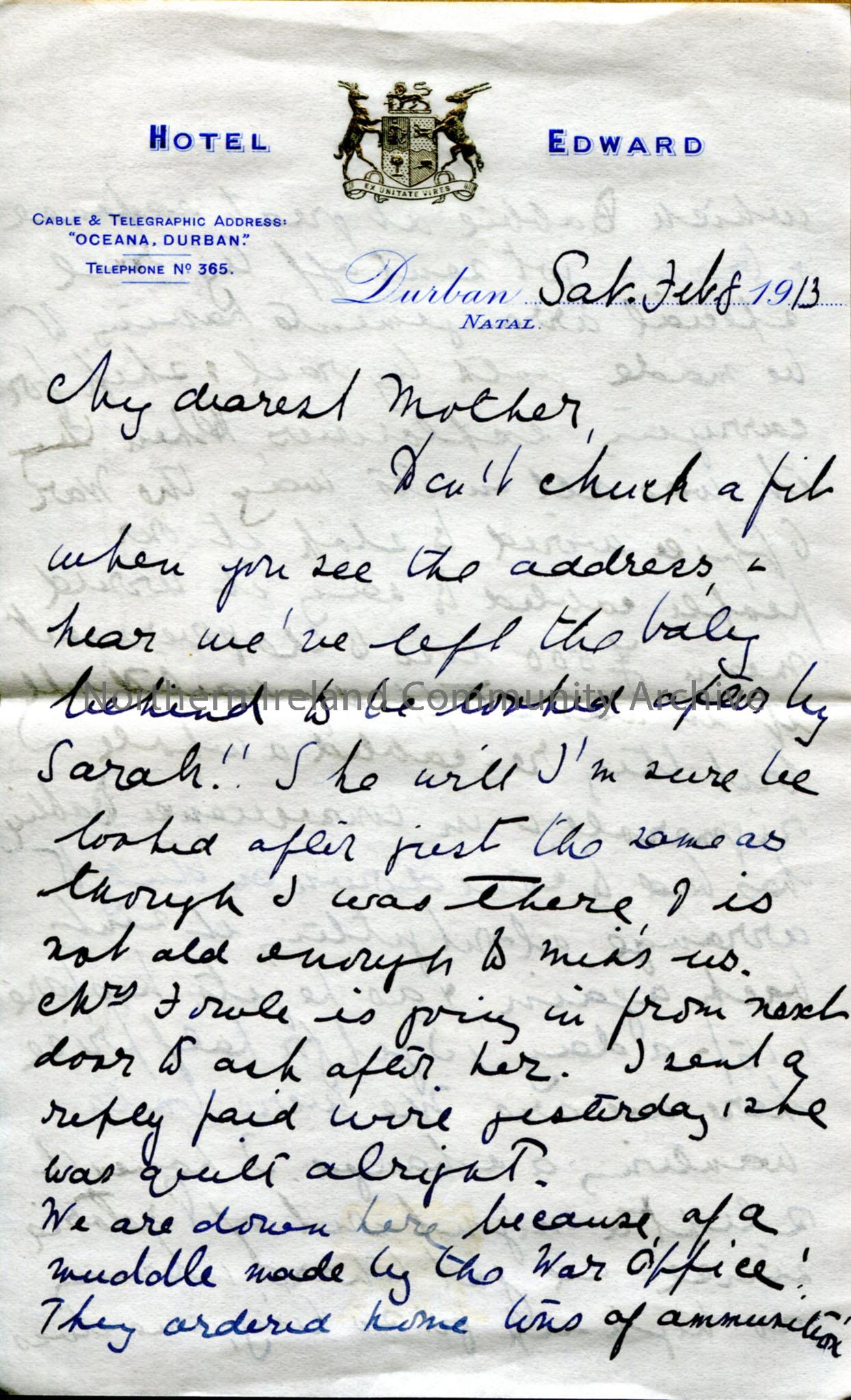 One of 7 pages of handwritten letter, on both sides, from Dorothy to her mother – on stationery notepaper of Hotel Edward in Durban. Military mix-up o…