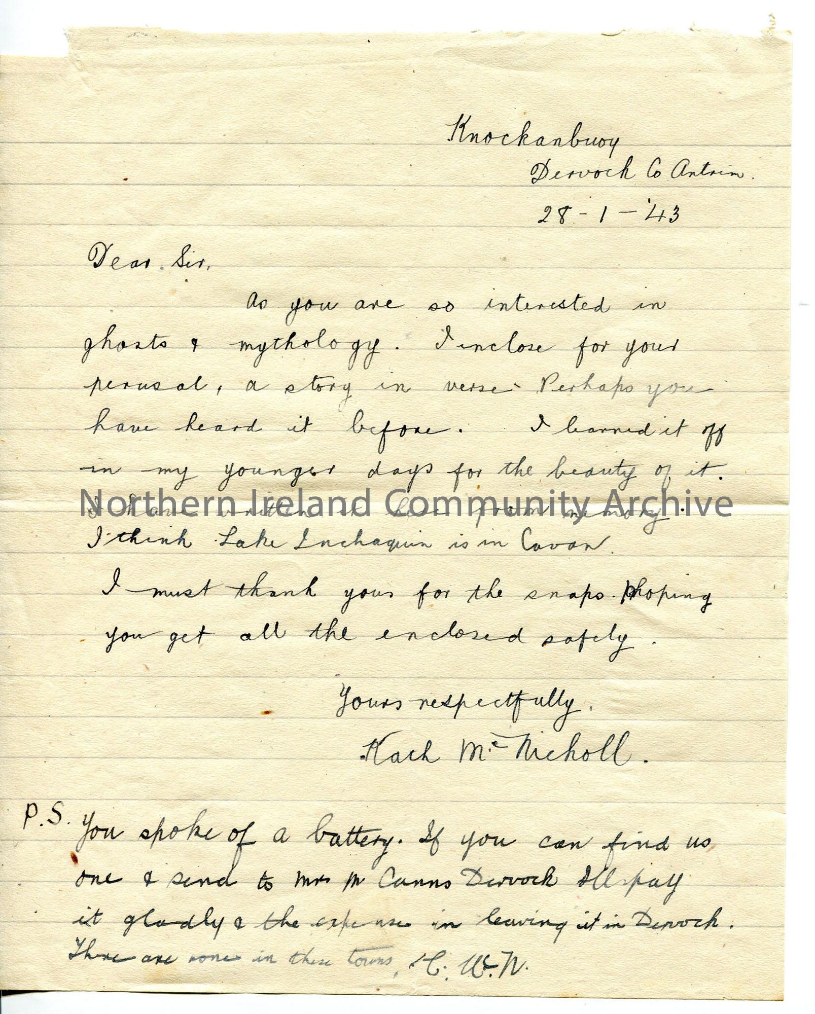 One of 7 pages of handwritten letter, with 12 verse folklore poem about ghosts included, learned for its beauty. Also wonders about a battery as none are available (WWII)