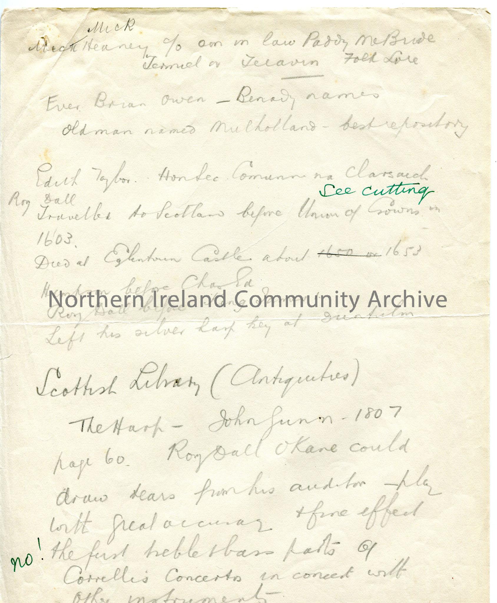 One of 7 pages of handwritten unorganised notes re Rory Dall, Eglinton Castle in Scotland, bagpipes, some tonic sol-fa notation, historical music perf…