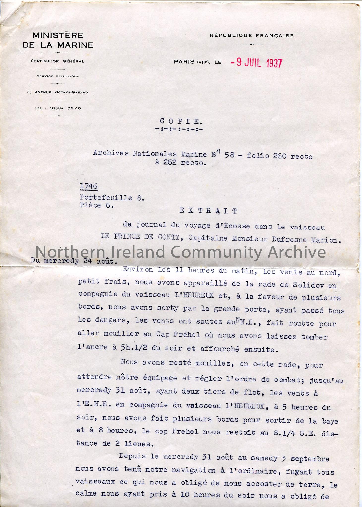 One of 7 pages of typed script - record extracts from French Marine Archives, written in French. The log book entries for the ship 'Le Prince de Conty', from 24.8.1746 until 10.10.1746