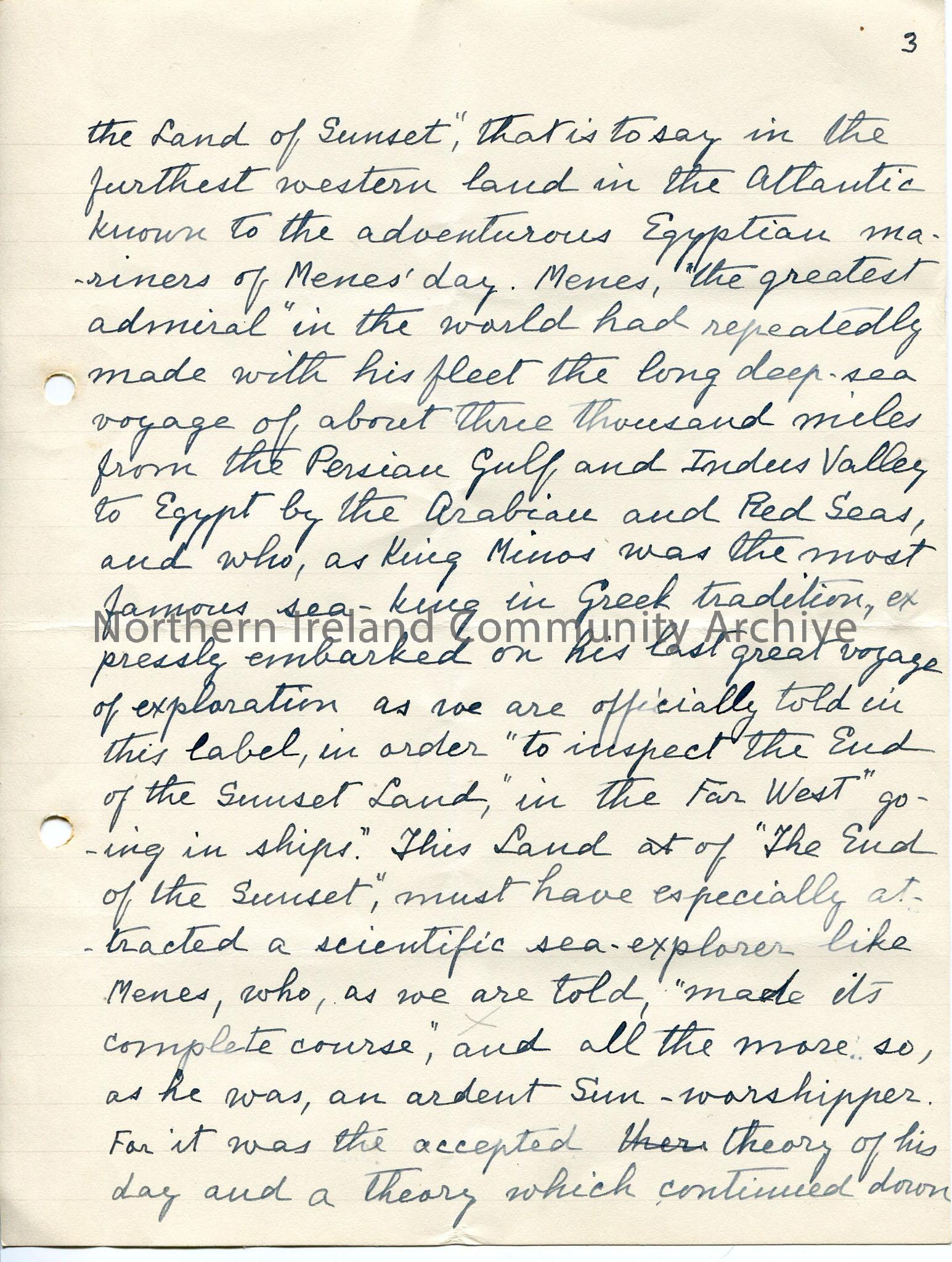 One of 7 pages under heading Menes 3407-3343 BC - title page and pages numbered 1-6. This is page 3. Handwritten story of Menes, Pharaoh of Egypt, and the possibility that his explorations by sea took him to Ireland