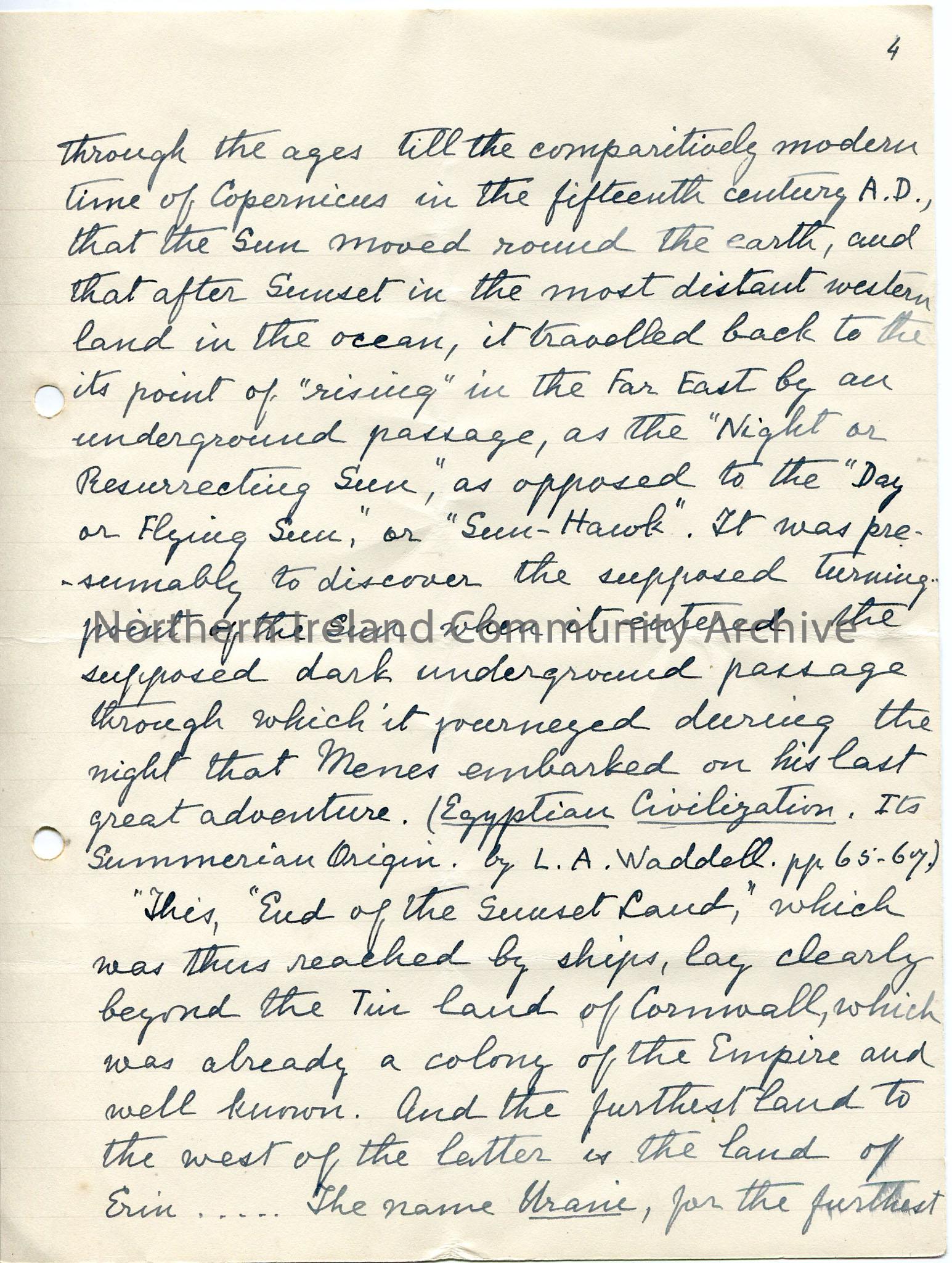 One of 7 pages under heading Menes 3407-3343 BC - title page and pages numbered 1-6. This is page 4. Handwritten story of Menes, Pharaoh of Egypt, and the possibility that his explorations by sea took him to Ireland