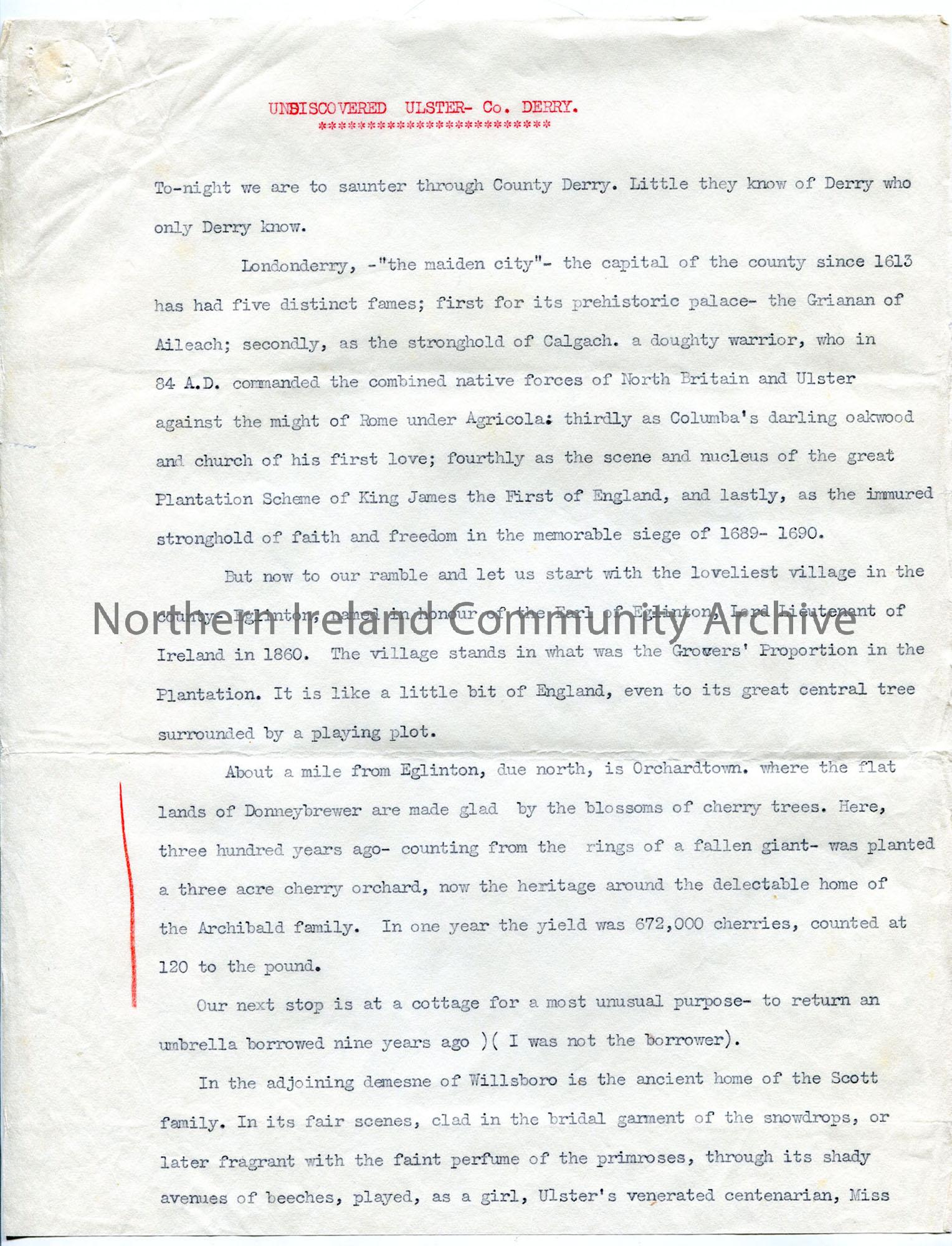 One of 7 pages/part pages of typed script, with handwritten corrections, under heading 'Undiscovered Ulster - Co Derry'. Different paper types and pages pieced together. A descriptive historical talk on County Londonderry, through various sites and locations