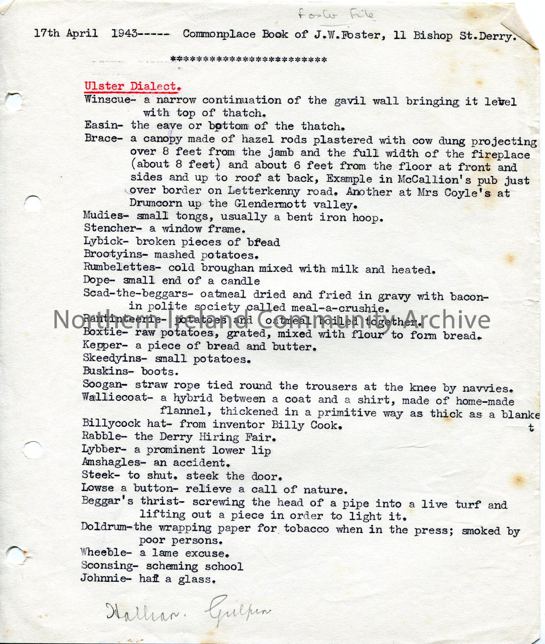 One of 7 typed pages under heading of ‘Commonplace Book of J W Foster’. Contains sections on: Ulster Dialect, with definitions of words ; traditional …