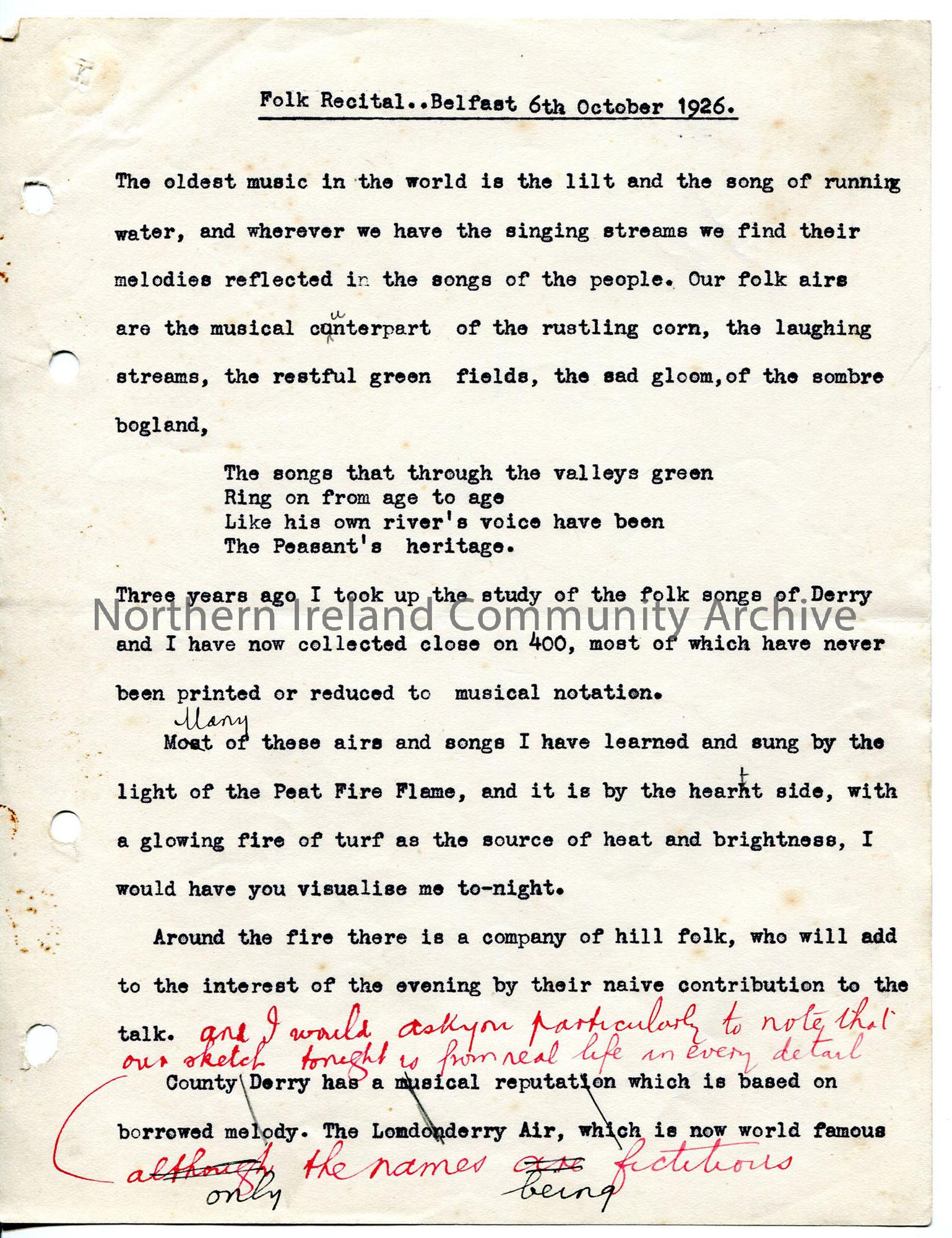 One of 8 pages of typed script under heading ‘Folk Recital’. Belfast 6th October 1926′, with added handwritten notes and red lines though some dialogu…
