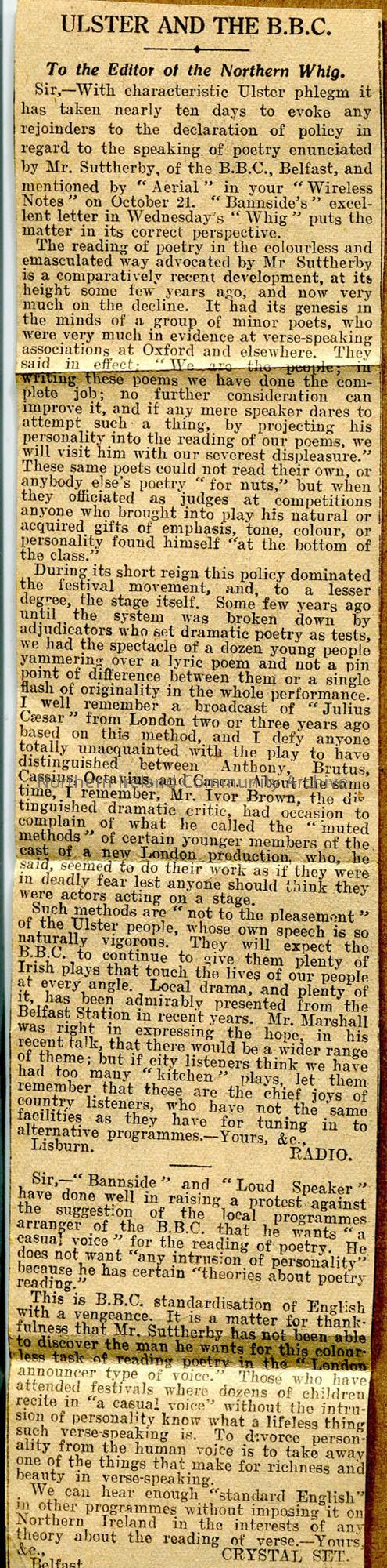 One of several newspaper cuttings, of letters to editor of ‘Northern Whig’, criticising BBC broadcasts in Ulster for English accent instead of local a…