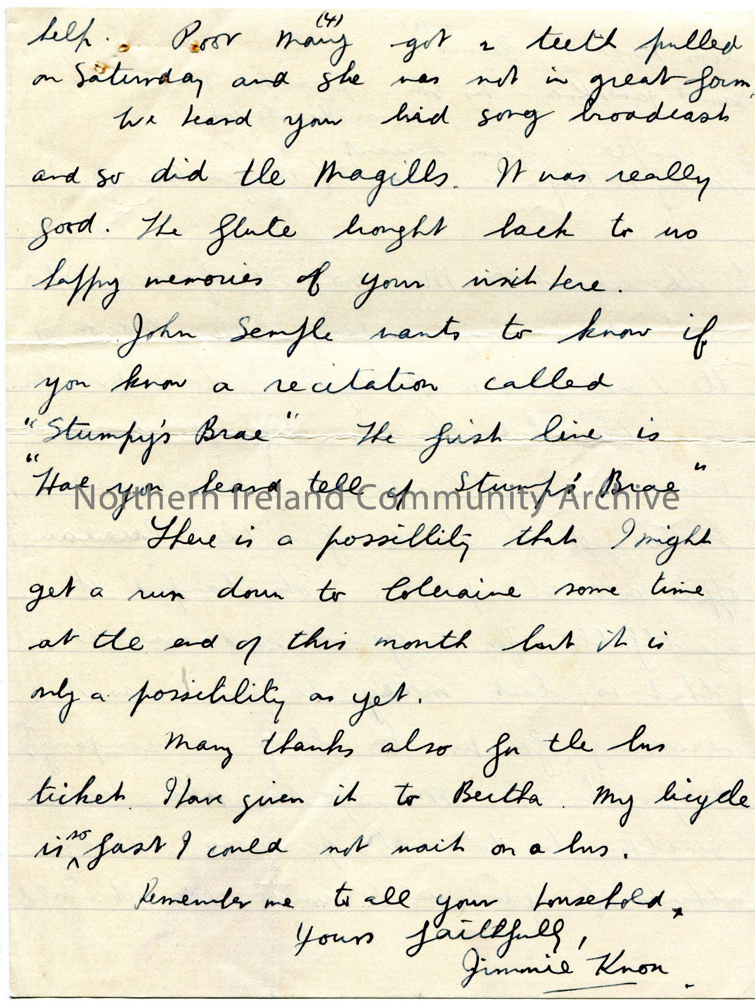 One page of a handwritten letter from Jimmie Knox (other pages are missing). One side lists names-Sam Knox, Samuel James Knox, John Semple, Paddy McKay and their occupations. Refers to Mrs Magill's pension and if recipient knows a Mr Gordon. Mentions broadcast involving a flute. Writer wants to find out about a recitation 'Stumpy's Brae' for John Semple. Writer looking to go to Coleraine and thanks recipient for bus ticket.