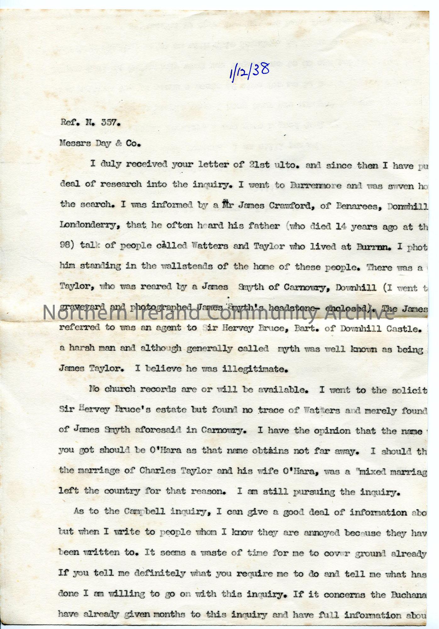 One page of a typed letter to Day & Co (appears to be first of 2 or more but remainder not present) relating to Watters and Taylor research and Campbell research (separate issue - see records).