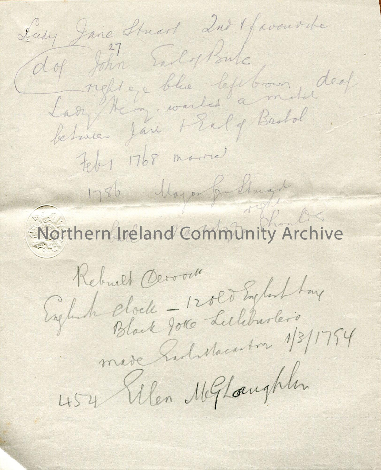 One page of handwritten rough notes relating to McCartney family – 18th century