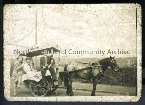 This photo was donated by Billy O'Neill of Stranocum Hall. His family ran an ice cream business from their home, 16 Rodden Foot, Ballymoney, from the 1930s to the late 1950s. Billy and his brothers all helped sell ice cream from about the age of 12 after school and at the weekends. This photo show his brother Leo with one of their horse-drawn carts. They had up to 5 ice cream carts at one time.