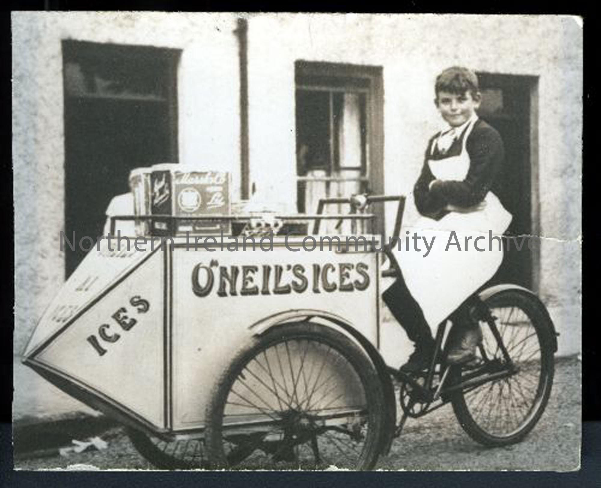 His family ran an ice cream business from their home, 16 Rodden Foot, Ballymoney, from the 1930s to the late 1950s. His father died working in England in 1942, leaving his mother Jeannie and her children to carry on the business. She can just be seen in this photograph in the window of their home with her white apron on. She made the ice cream in a small ice house at the rear of the house. Billy and his brothers all helped sell ice cream from about the age of 12 after school and at the weekends. His mother remarried after the war and his stepfather also helped in the business.
