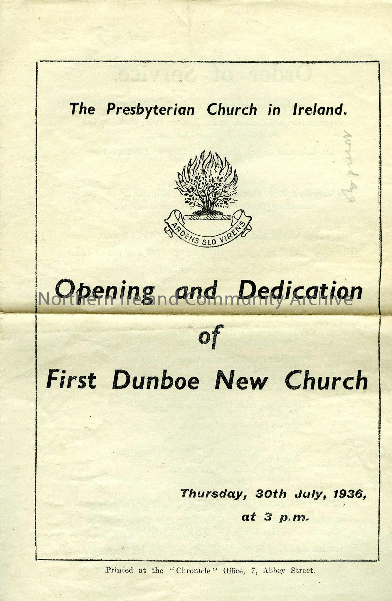 Order of Service for Opening and Dedication of First Dunboe New Church
