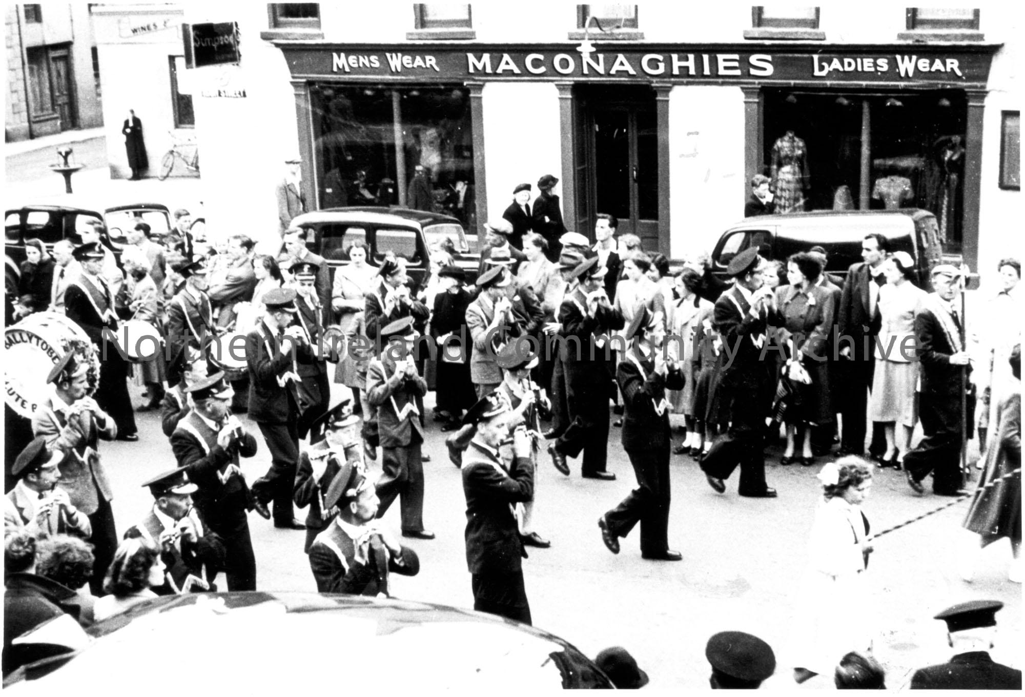 Orange Band marching past Maconaghies shop, High Street