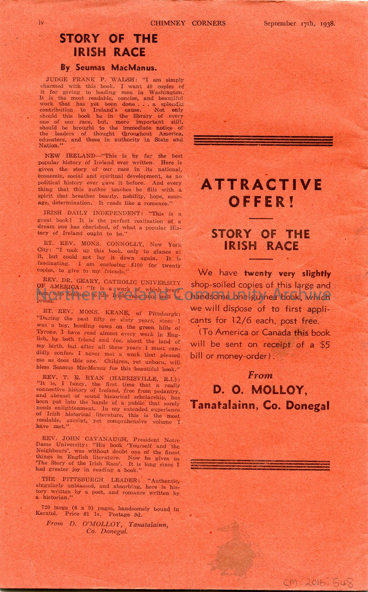 Orange booklet. Chimney Corners. Edited by Seumas MacManus. Dated Saturday 17th September, 1938. Poem or words to song on front cover titled, "The Dead at Clonmacnoise". Monthly publication of poems, songs and stories.