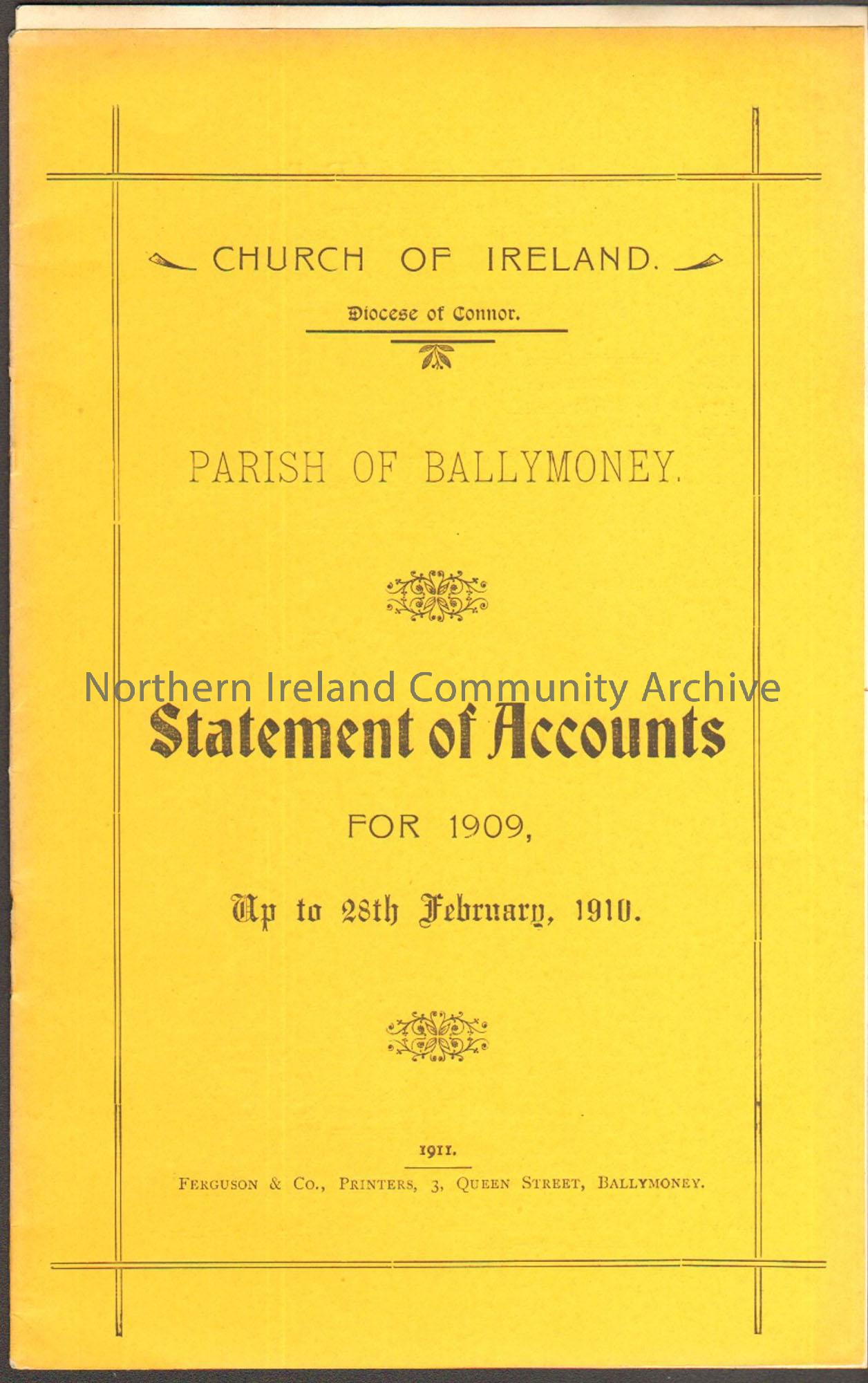 Orange booklet, Church of Ireland, Parish of Ballymoney, Statement of Accounts for 1909 up to February 28th, 1910