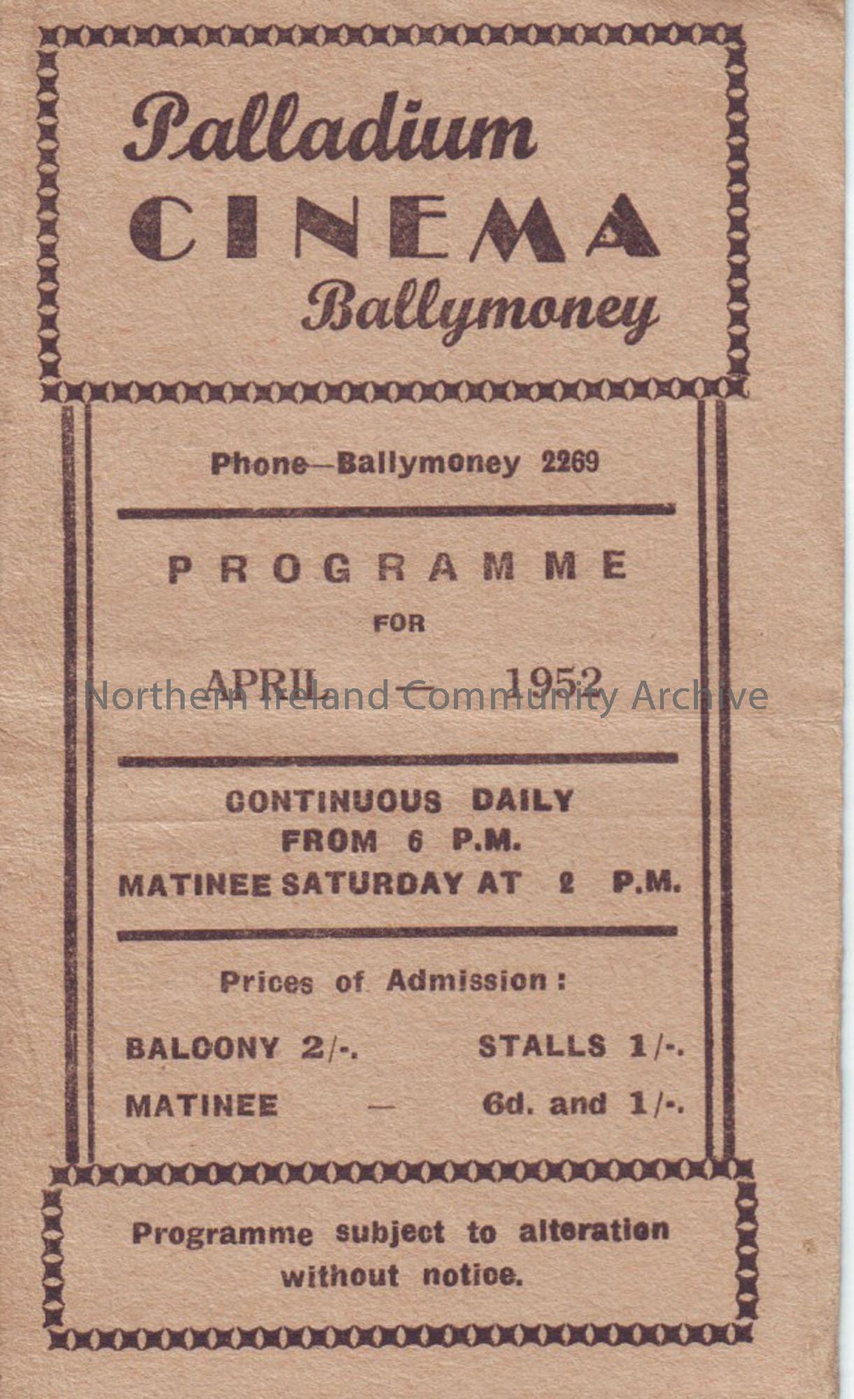 orange monthly programme for Ballymoney Palladium cinema April 1952