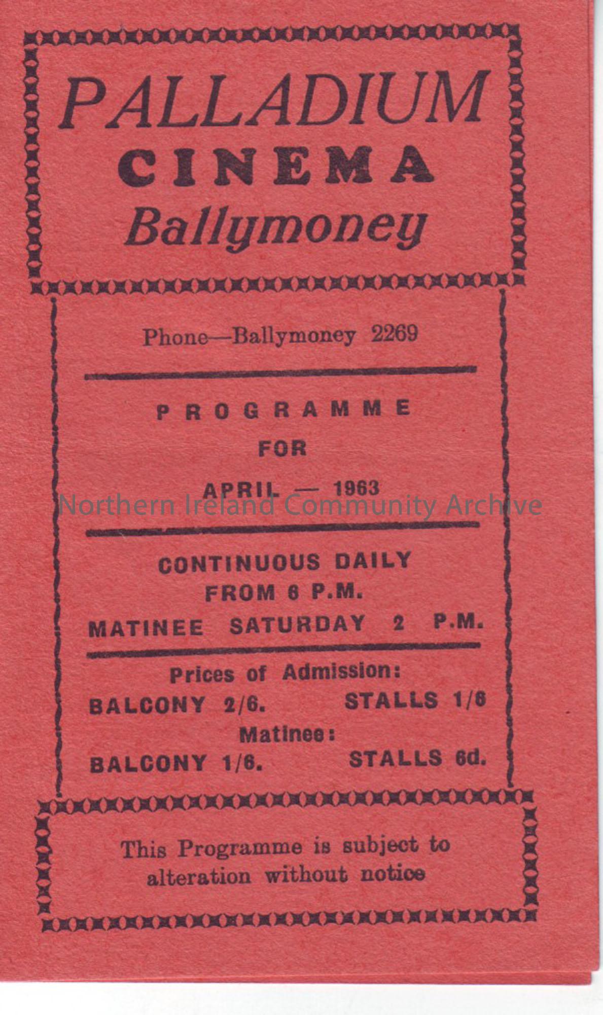 orange monthly programme for Ballymoney Palladium cinema- April 1963