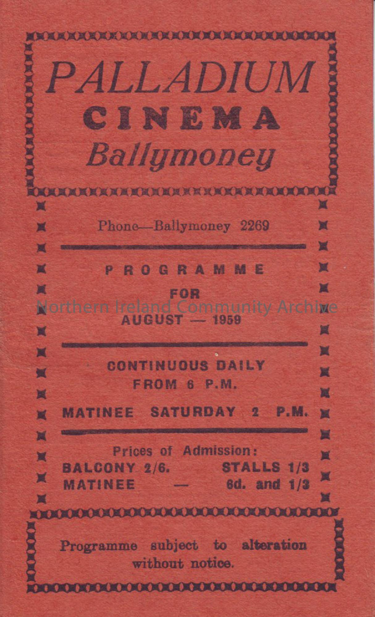 orange monthly programme for Ballymoney Palladium cinema- August 1959