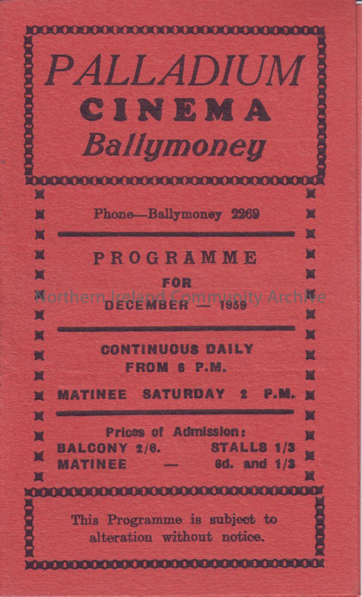 orange monthly programme for Ballymoney Palladium cinema- December 1959
