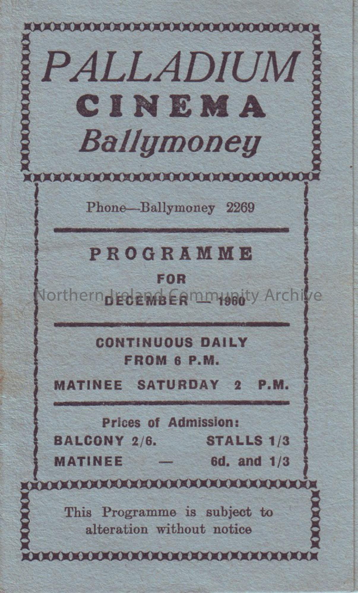orange monthly programme for Ballymoney Palladium cinema- December 1960