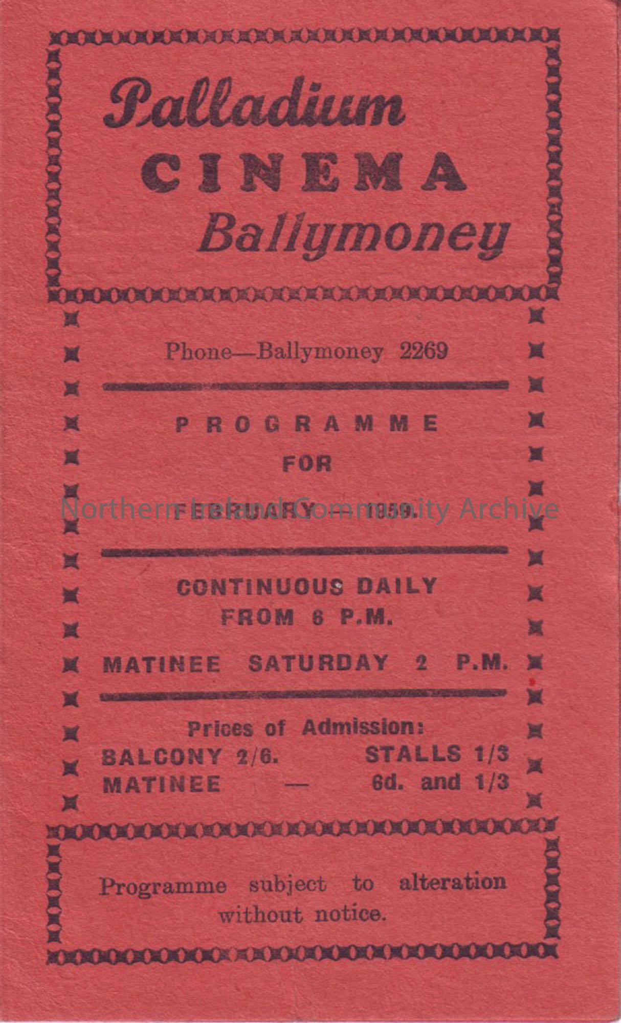 orange monthly programme for Ballymoney Palladium cinema- February 1959
